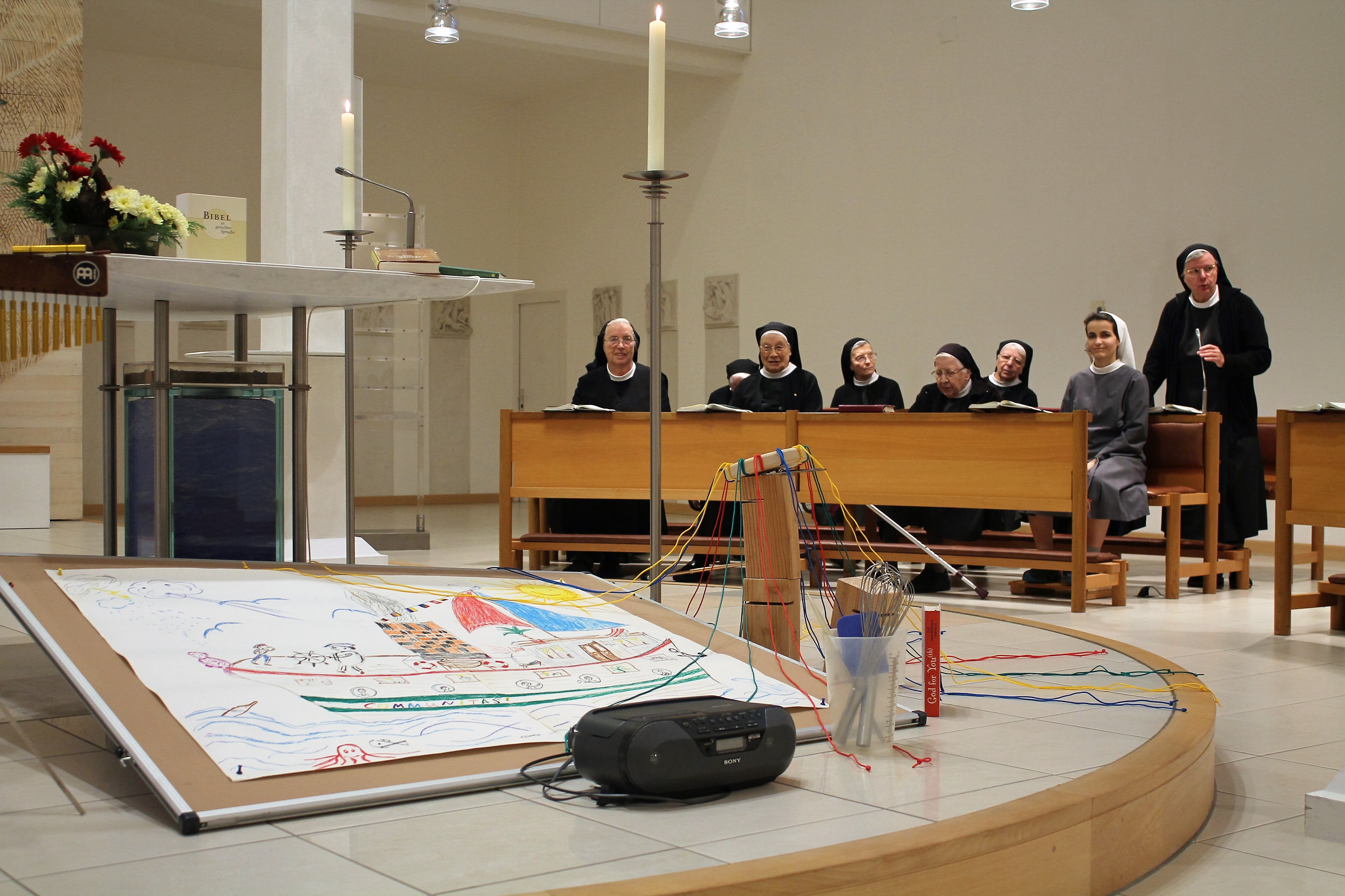 Nach einem gemeinsamen Start im Plenum mit allen Schwestern und einer kurzen Einführung von Sr. Ruth Schönenberger und Sr. Elisabeth-Magdalena Zehe teilten sich die Schwestern mithilfe von gemeinsamen Geschmacksvorlieben in Bezug auf Schweizer Schokolade in kleinere Gruppen ein. „Sich einlassen“ war dabei das Motto, denn die meisten wussten nicht, was in den einzelnen Gruppen auf sie zukommt. Denn die Gruppen hatten völlig Unterschiedliches vor. Eine Gruppe verbrachte 2 Stunden mit dem Befüllen von Windbeuteln. Eine andere widmete sich musikalischen Experimenten. Eine weitere experimentierte ebenfalls, allerdings im Tanzen, und wieder eine andere Gruppe gestaltete ein gemeinsames Bild zum Thema Gemeinschaft. Und die fünfte Gruppe verbrachte die Zeit mit Spielen. Spielen, das hieß: Mithilfe von Stricken einen Turm aus Holzklötzen bauen. Klingt einfach, aber braucht ein gewisses Feingefühl im Miteinander. Während die einen es sehr genossen, einfach mal etwas zu tun, ohne dabei am Ende ein Ergebnis präsentieren zu müssen, waren die anderen stolz und beeindruckt, dass doch etwas bei ihrem Tun herauskam und wollten ihr Ergebnis doch mit allen anderen teilen. So kamen wir in den Genuss einer Bildbetrachtung und, ganz kulinarisch, in den Genuss von feinen Windbeuteln.