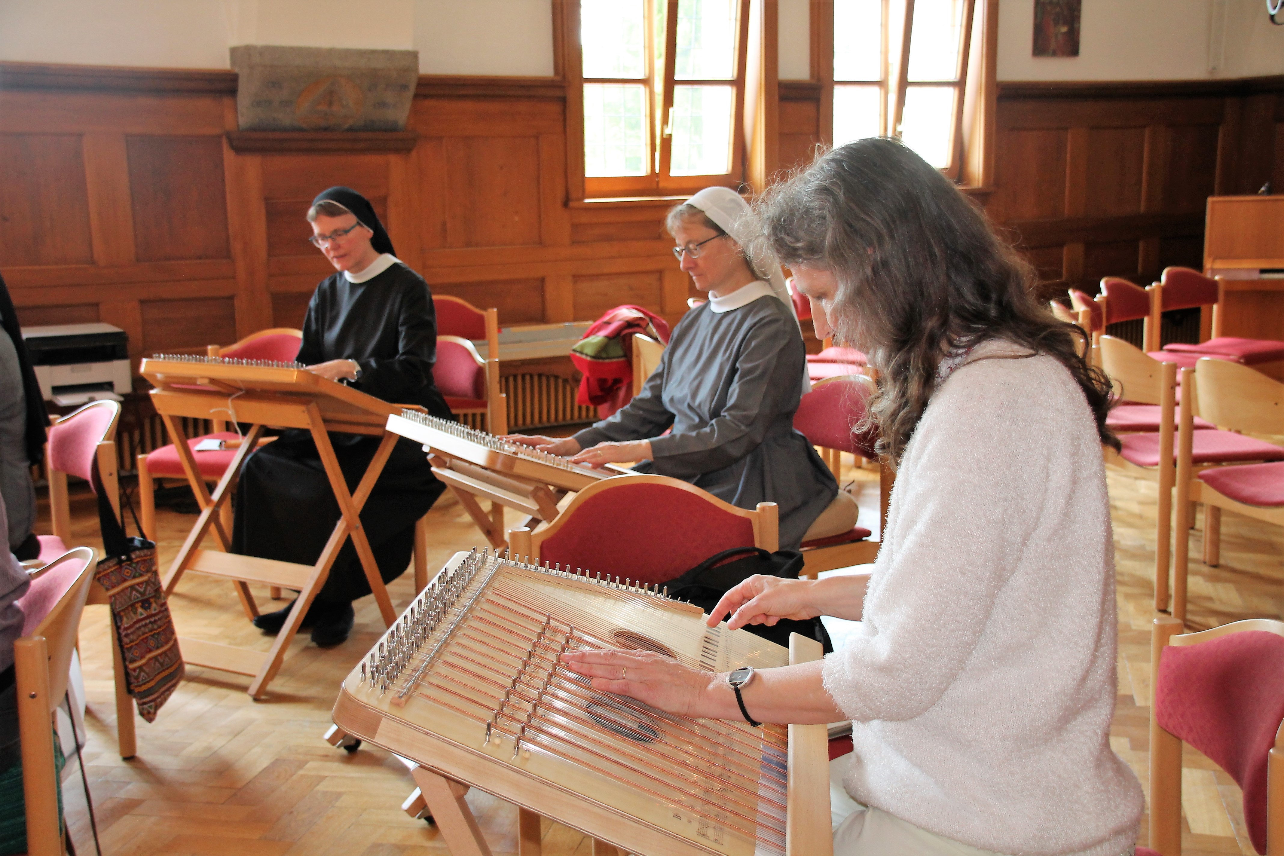 Neben einem Teilnehmer, der nicht aus dem Kloster kommt, nehmen 5 Schwestern an dem Kurs teil. Bisher hat das Kloster noch kein eigenes Instrument, aber kleine musikalische Kostproben von Frau Weidemann während der Messe machen Lust und Neugier darauf, ein solches Instrument ebenfalls auch bei uns zur Begleitung der Psalmen zum Einsatz zu bringen.