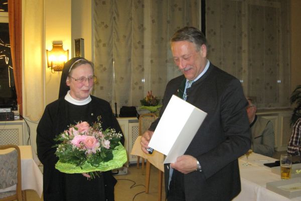 Bgm. Steigenberger überreicht Sr. Angela Kirchensteiner die Urkunde.