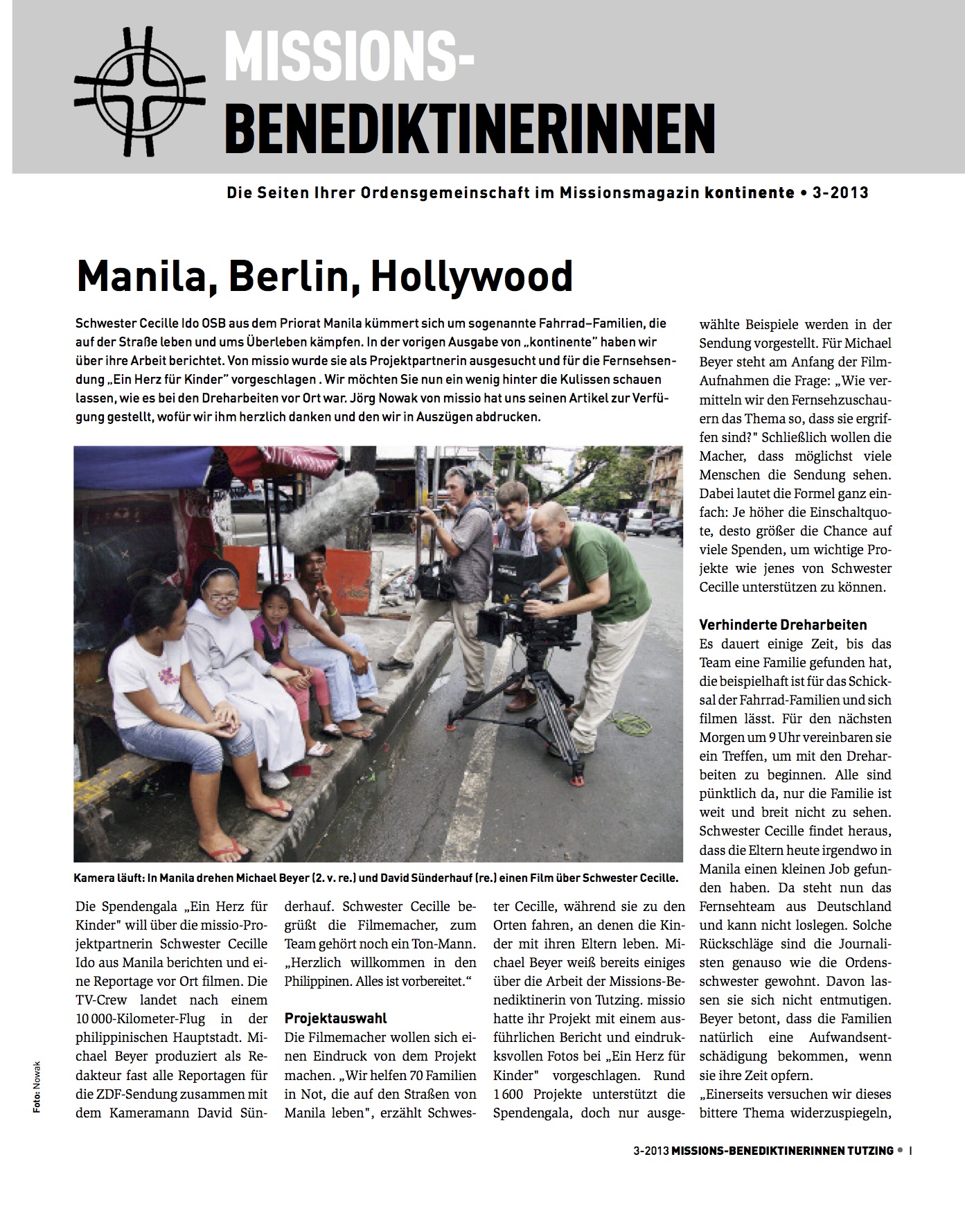 Schwester Cecille Ido OSB aus dem Priorat Manila kümmert sich um sogenannte Fahrrad–Familien, die auf der Straße leben und ums Überleben kämpfen. In der vorigen Ausgabe von „kontinente” haben wir über ihre Arbeit berichtet. Von missio wurde sie als Projektpartnerin ausgesucht und für die Fernsehsendung „Ein Herz für Kinder” vorgeschlagen . Wir möchten Sie nun ein wenig hinter die Kulissen schauen lassen, wie es bei den Dreharbeiten vor Ort war. Jörg Nowak von missio hat uns seinen Artikel zur Verfügung gestellt, wofür wir ihm herzlich danken und den wir in Auszügen abdrucken.